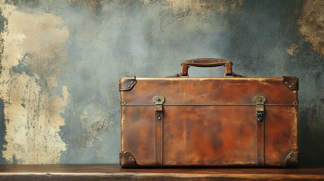 Luxurious leather suitcase on textured tan color surface