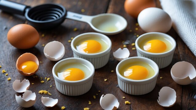 Four Divided Eggs in Small White Ramekins Egg yolks and egg whites displayed with an egg separator and eggshells on a wooden surface