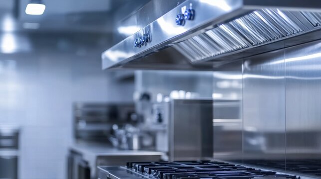 Stainless steel kitchen extractor hood with bright lights, isolated in a clean, professional restaurant setting, showcasing modern kitchen equipment