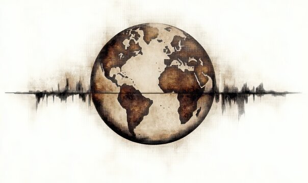 Artistic depiction of a vintage-style globe with continents in sepia tones and a horizontal waveform passing through its center conveying sound or energy