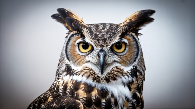Intense gaze of a great horned owl staring directly at the camera with golden eyes focus.