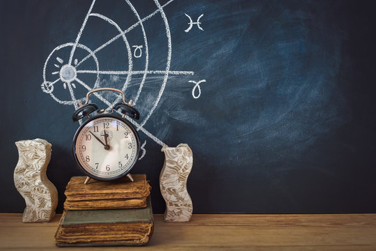 Alarm clock and old books next to a candle on a horoscope background drawn on a chalkboard