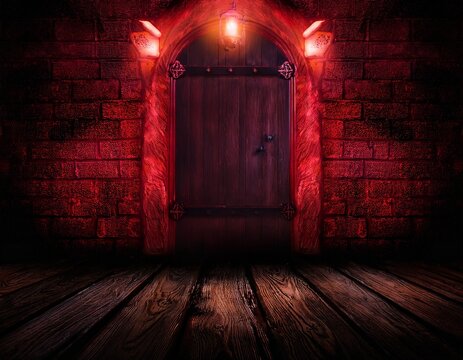dark room old wooden door red lights mystery horror movie game background