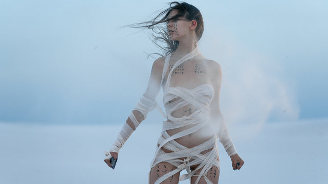 Girl in desert in image of Egyptian mummy with knife in her hand.