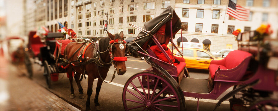 Panoramic view of horse drawn carriages at the roadside, Central Park, Manhattan, New York City, New York State, USA.