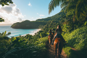 Horseback riders traveling along a tropical beach trail, tourist activities on vacation concept