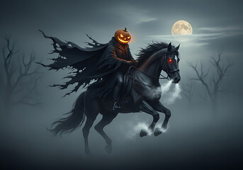 Headless horseman with jack-o'-lantern head riding a black horse under a full moon