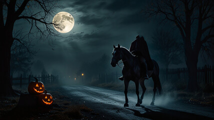 The headless horseman rides through a deserted, moonlit road, his imposing figure silhouetted against the full moon. He holds a glowing, carved pumpkin head aloft in one hand,