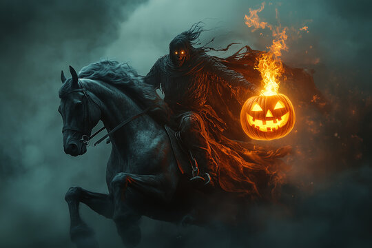 Headless horseman with jack-o'-lantern head riding a black horse with glowing red eyes