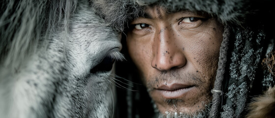 Mongolian horseman in fur hat with horse