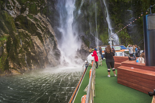 Hornblower Boat Full of Tourists Under Rainbow Sprayed By Horseshoe Waterfall, Niagara Falls, Ontario, Canada