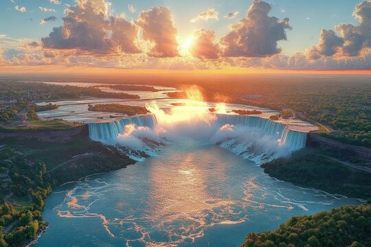 Aerial top landscape view of Niagara Falls and tour boat in water between US and Canada.  Horseshoe of famous Canadian waterfall on sunny day