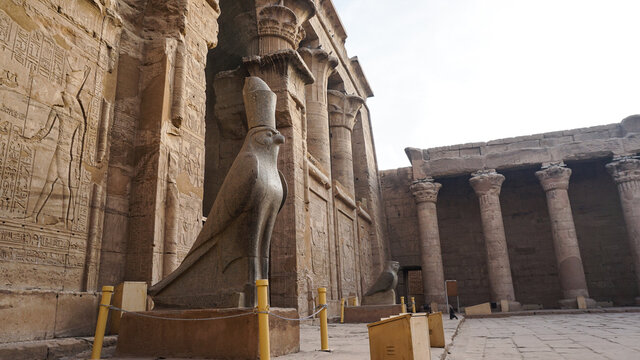 Portrait in hieroglyph of ancient Egyptian falcon god Horus in Edfu, Egypt