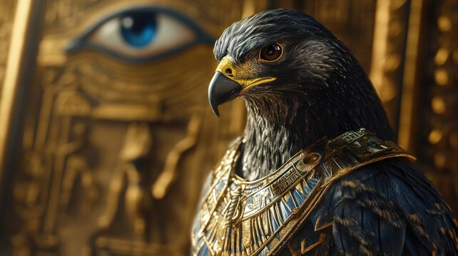 Powerful Horus, falcon-headed god, with the Eye of Horus shining brightly, embodying protection and kingship.