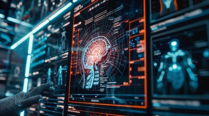 The image shows a futuristic control room. In the center of the room is a large screen with a brain scan on it. The walls are lined with screens showing various data and readouts.