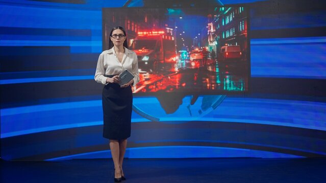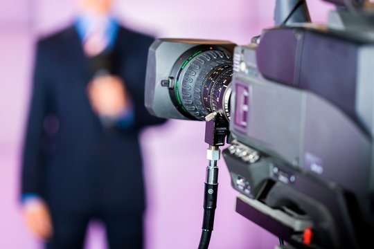 Agreeable TV announcer being involved in work