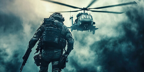 Soldiers with gun are walking along the river. War, soldier army, gun and hostage rescue concept.