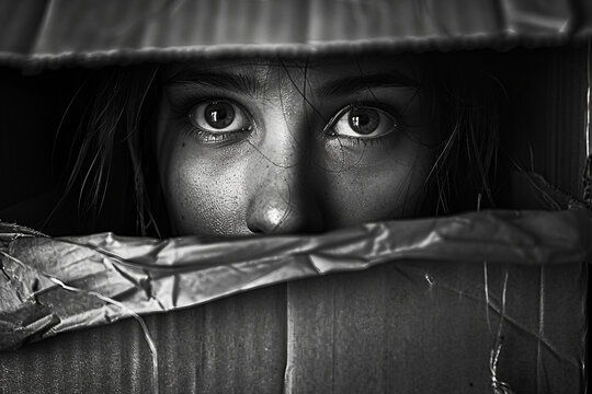 Woman taped up and taken hostage on dark background