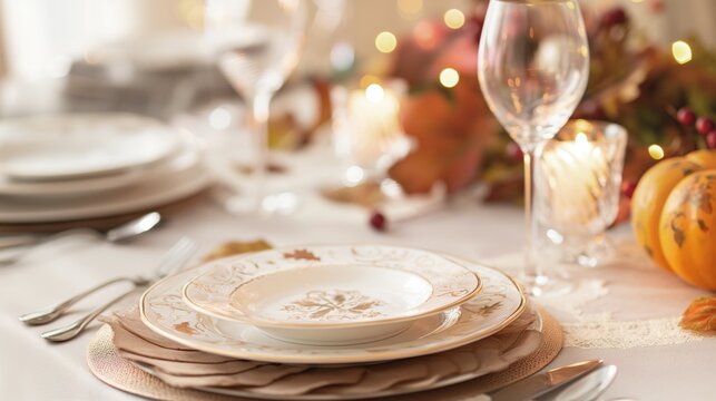 Elegant table setting with white dishes and wine glasses for a festive Thanksgiving dinner gathering with family and friends