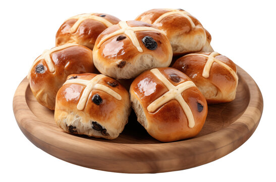 Easter Breakfast with Hot Cross Buns, served on Wooden Chopping Board. Top View