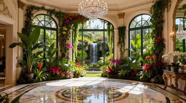 Grand, bright atrium with marble floor, columns, and lush greenery.