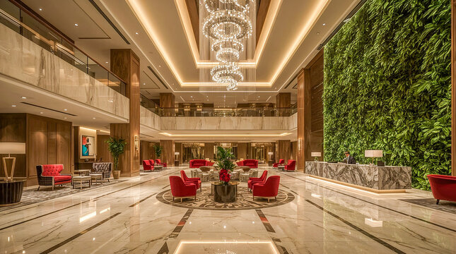 Luxurious hotel lobby with a stunning crystal chandelier, marble floors, plush seating, and a vibrant green living wall.