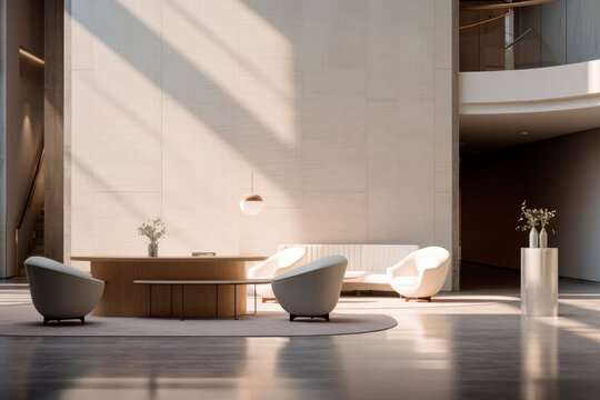 Modern luxury hotel lobby interior with reception desk and guest relaxation zone designed for welcoming guests