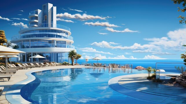 exterior of the pool area of a luxury modern hotel in a tropical climate. relaxing holiday of lazy tanning for tourist his vacation