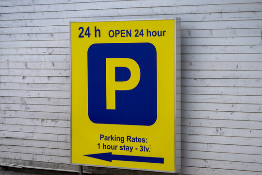A yellow and blue parking sign indicating 24-hour operation and hourly rates is mounted on a white wooden plank wall.