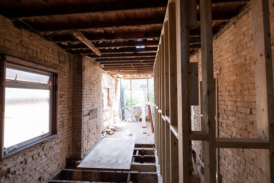 Europe, UK, England, Surrey, scaffolding on house roof renovation