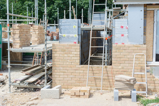 Renovation projects. Building of extension of the existing house, finished brick walls, scaffoliding, selective focus