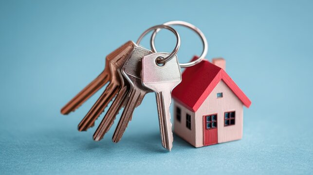 House keys on keychain symbolizing home ownership against blurred background
