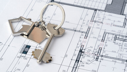 Silver house keys with keychain over architectural house blueprint