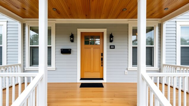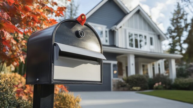 Mailbox on wall at Entrance of house. White mailbox in front of home. Entrance of house door decorated with autumn leaves for holiday. Fall festive yellow leaf, twigs and pumpkins on facade home.