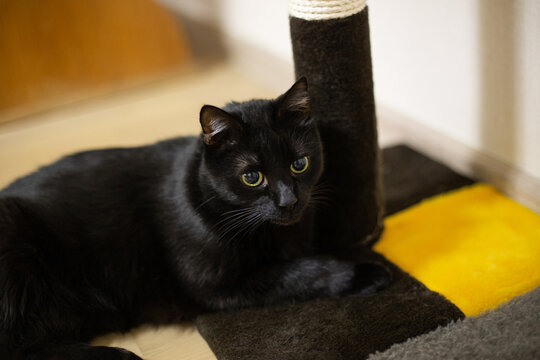 Man petting cream and white cat on wooden stairs at home, sunlight and relaxation