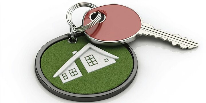 The house key with a blue house shaped keychain on a rustic wooden surface