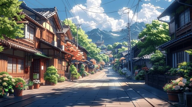 beautiful japanese street with houses and cars anime style mountains sunny day digital art kyoto osaka cozy lofi architecture 4k resolution