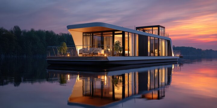A photo of a modern houseboat with large windows 8K , high-resolution, ultra HD,up32K HD