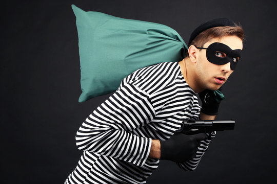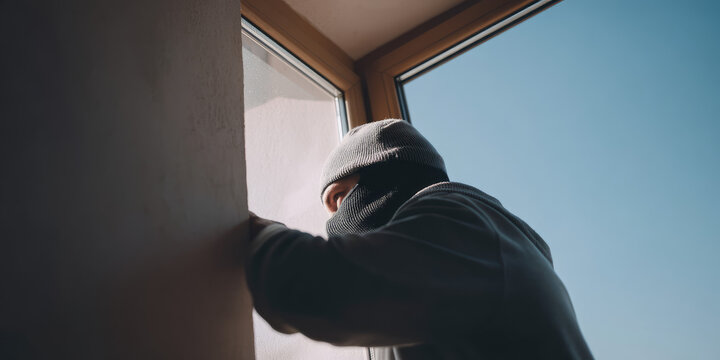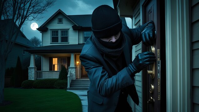 A burglar tries to break into a home, depicting the idea of unauthorized entry and housebreaking, commonly associated with theft, intrusion, and issues of home security