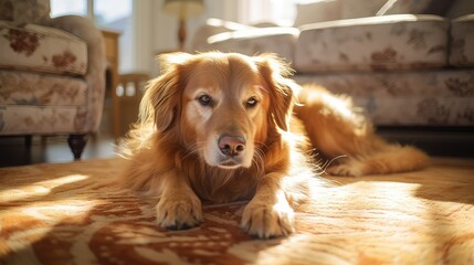 Cute brown French Bulldog puppy sitting on a potty training pad in a modern living room learning housebreaking obedience.