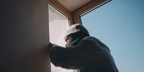 A masked burglar climbs through the window of a private house. Home invader, crime, robbery.