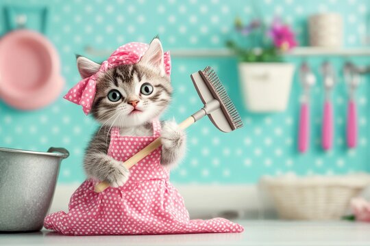 Dog sitting beside cleaning products and towels on a blue background. Studio pet portrait. Pet care and spring cleaning concept. Design for banner, poster with copy space