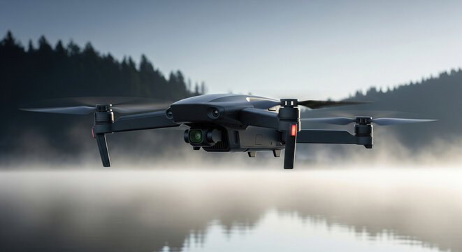Modern black quadcopter drone hovering above misty lake water near forest mountain view