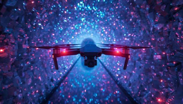 Hovering drone navigating neon crystal tunnel with glowing led trail, cyberpunk flight