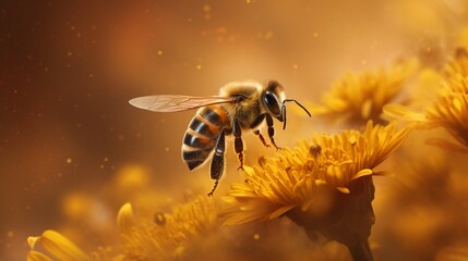 A diligent worker bee, wings minutely detailed, hovering against a sumptuous mustard background