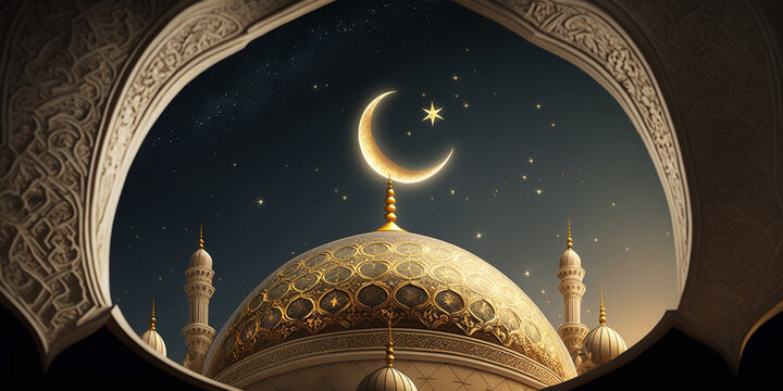 Serene night sky with a shimmering crescent moon gracefully hovering above an intricately designed mosque dome, evoking a sense of peace and spiritual reflection
