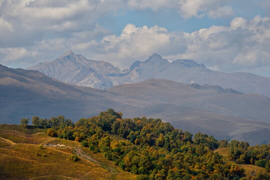 Russia. The Elbrus region. The high mountain peaks of the North Caucasus are surrounded by morning misty clouds hovering at different levels of inaccessible rocks.