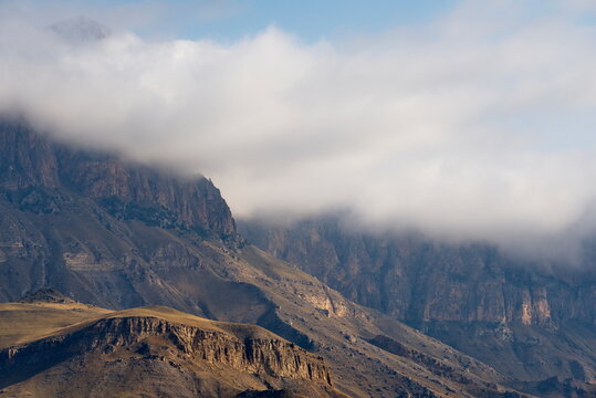 Russia. The Elbrus region. The high mountain peaks of the North Caucasus are surrounded by morning misty clouds hovering at different levels of inaccessible rocks.