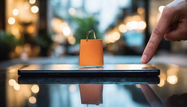Person's finger hovering over blank smartphone screen with shopping bags reflected in glass surface