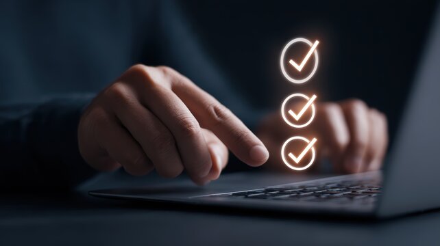 A hand hovering over a laptop keyboard with a glowing check mark overlay